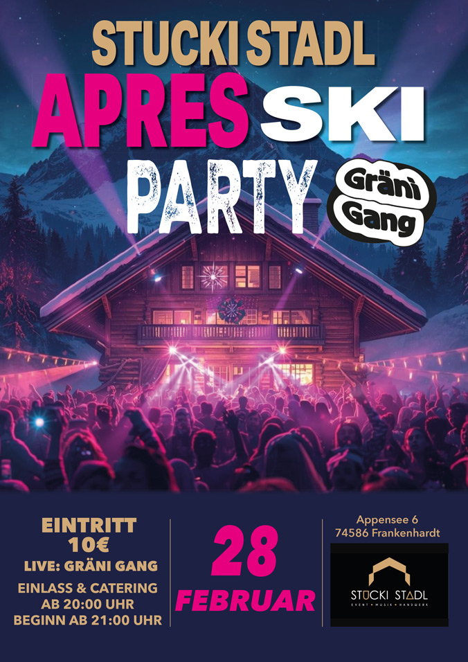 Am 28. Februar 2026 lädt der Stucki Stadl gemeinsam mit der Gräni Gang zur ultimativen Apres Ski Party ein. Unplugged, mittendrin und mit Remmidemmi: Die Band spielt auf einer 360° Bühne – mit Bühnenwechsel auf zwei Stockwerken. Funkgesteuert und mitten im Publikum liefert die Gräni Gang ein wildes Programm für alle Altersklassen – von Volksmusik über Schlager, Ballermann, Pop und Rap bis hin zu Classic Rock. Ein Abend, der garantiert für beste Stimmung sorgt.